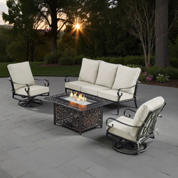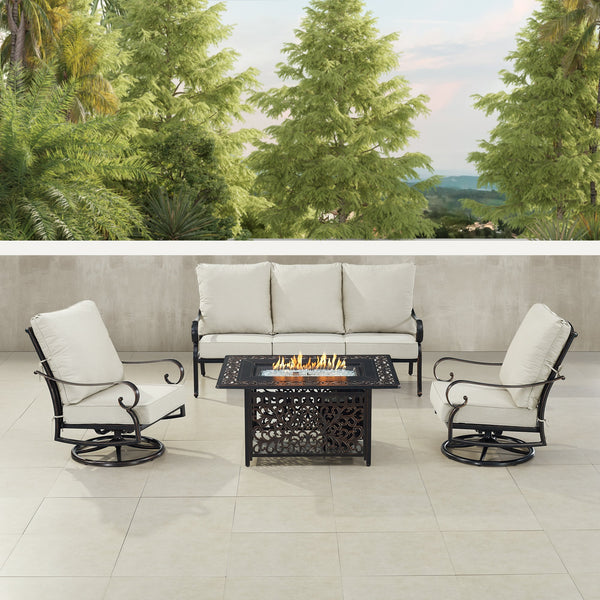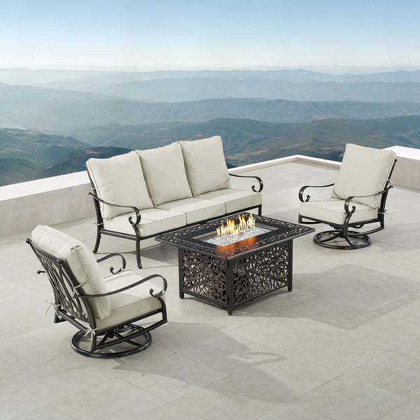 Black Aluminum 48" Fire Table Set with Sofa and Two Club Chairs - Light Grey cushions