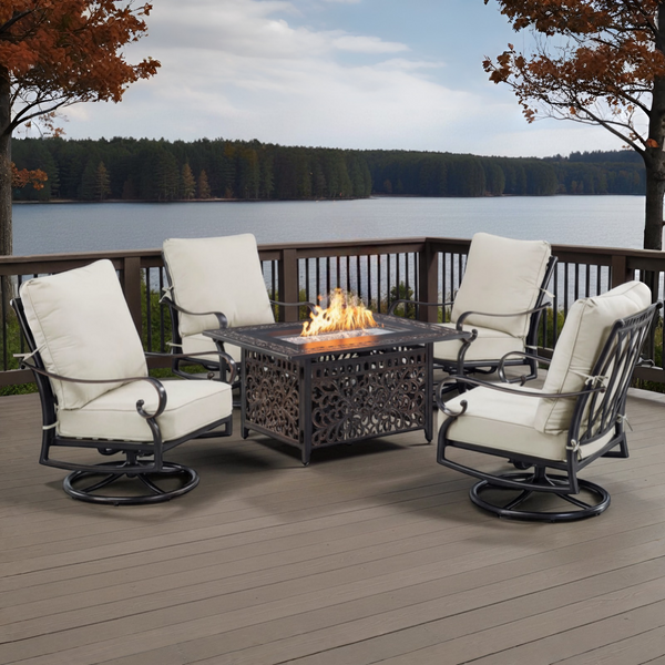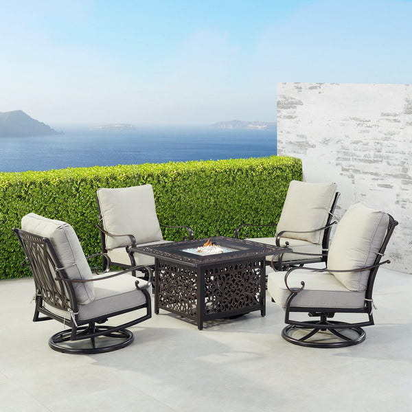 Black Aluminum 42" Fire Table Set with Four Club Chairs - Light Grey cushions