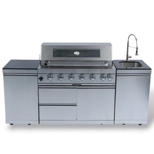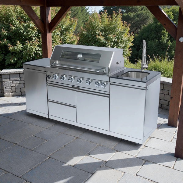 Castelle Flame 43-Inch 6-Burner 85K BTU Stainless Steel Outdoor BBQ Kitchen Island Grill With Wine Cooler, Rotisserie, And Sink (SAK19476)