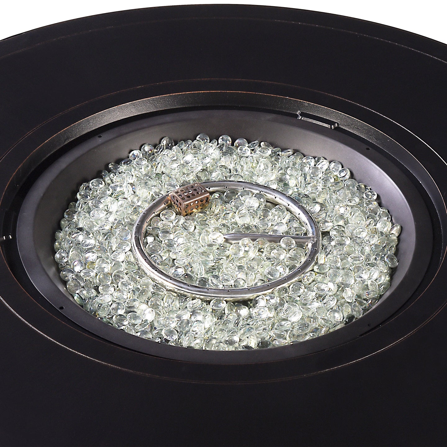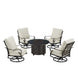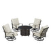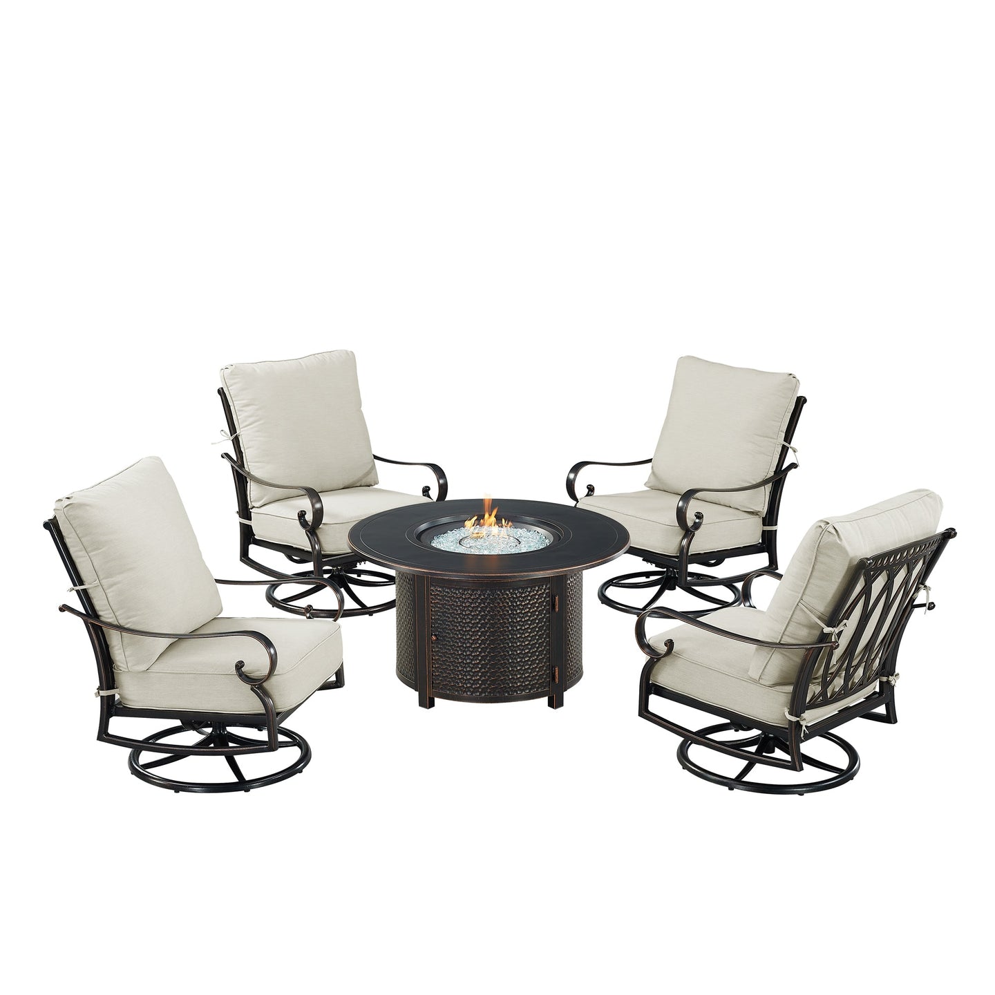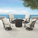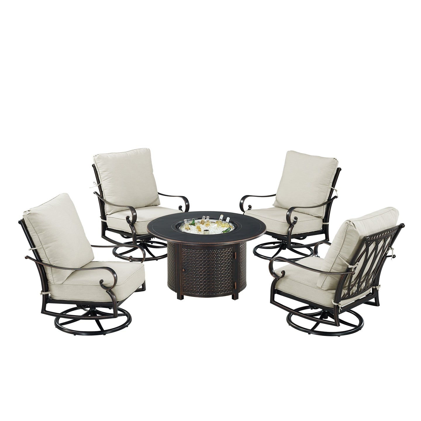 Introducing our outdoor fire table set with four deep seating swivel rocking chairs– the epitome of elegance and comfort for your outdoor living space. Crafted with meticulous attention to detail, this set seamlessly combines style and functionality to create the perfect ambiance for your gatherings. The centerpiece of this ensemble is the stunning fire table, designed to be the focal point of your outdoor entertainment area. Its aluminum construction ensures durability and longevity, while the antique copper finish adds a touch of timeless sophistication. Gather around the warm glow of the fire with friends and family, creating memorable moments under the open sky. What makes this set truly exceptional is the innovative drop-in ice bucket feature seamlessly integrated into the fire table, adding an extra layer of convenience to your outdoor experience. The set includes four chairs, each meticulously crafted with a durable aluminum frame in an antique copper finish. The deep-seating design and plush light grey cushions provide unparalleled comfort, inviting you to relax and unwind in style. The cushions are not only luxuriously soft but also weather-resistant, ensuring they maintain their beauty despite the elements. Whether you're hosting a casual evening with friends or enjoying a quiet night under the stars, this fire table set is the perfect addition to elevate your outdoor experience. Create lasting memories and a cozy atmosphere with this exquisite combination of durable materials, stylish design, and functional innovation. Upgrade your outdoor space with our outdoor fire table set – where sophistication meets comfort, and every gathering becomes a cherished occasion.