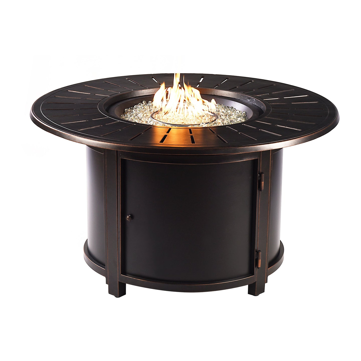 Enhance your outdoor space with the inviting warmth and ambiance of our Round 44-Inch Aluminum Fire Table. Whether on your patio, deck, or in your backyard, this stylish and functional fire pit brings a touch of elegance and coziness to your outdoor living area. Available in a sleek clean black antique copper, brown, grey, or white powder-coated finish, this fire pit is designed to complement your outdoor decor.