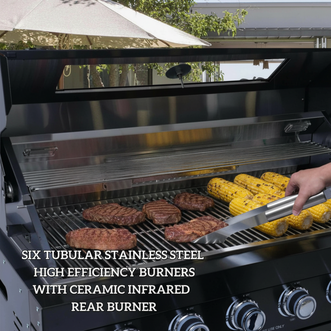 - Equipped with six high-efficiency burners, a rear infrared burner, and a side burner, this grill unleashes a massive 85,000 BTUs of consistent heat for perfect results every time.