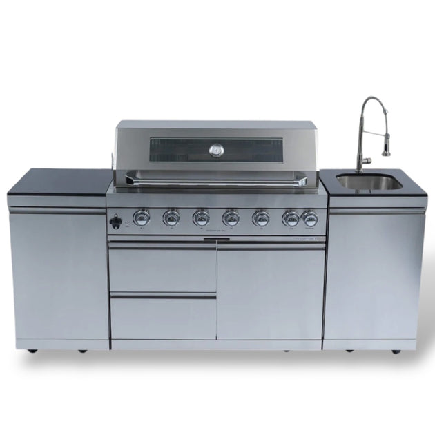 Castelle Flame 85K BTU Outdoor BBQ Kitchen Grill Island With 43-Inch 6-Burner Grill, Wine Fridge, Rotisserie Kit, And Sink (SAK23864)
