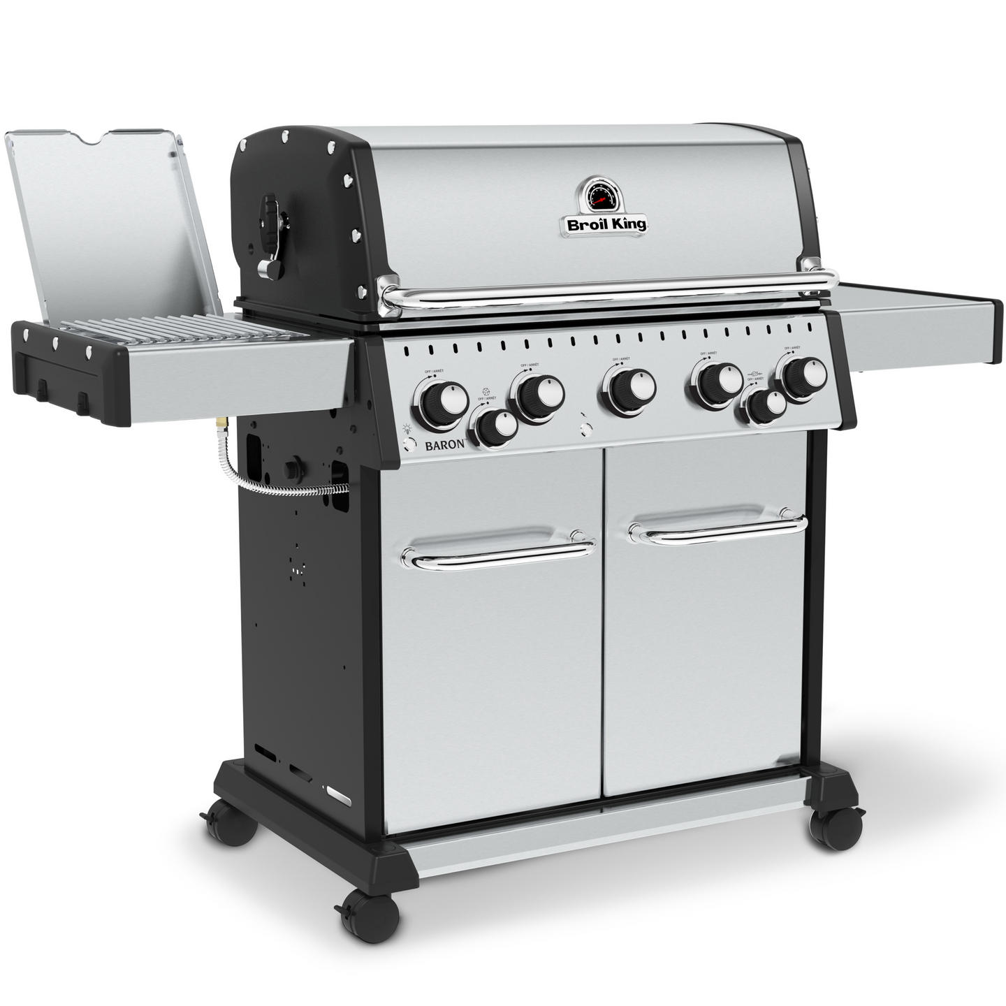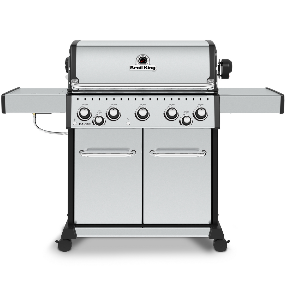 The Broil King Baron S 590 PRO IR features 570 sq. in. primary cooking surface and includes a durable cast aluminum oven, 5 stainless steel Dual-Tube burners, illuminated control knobs, stainless steel 8mm rod cooking grids, stainless steel warming rack and electronic ignition.