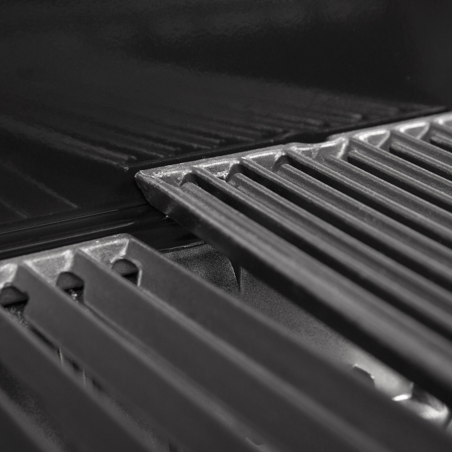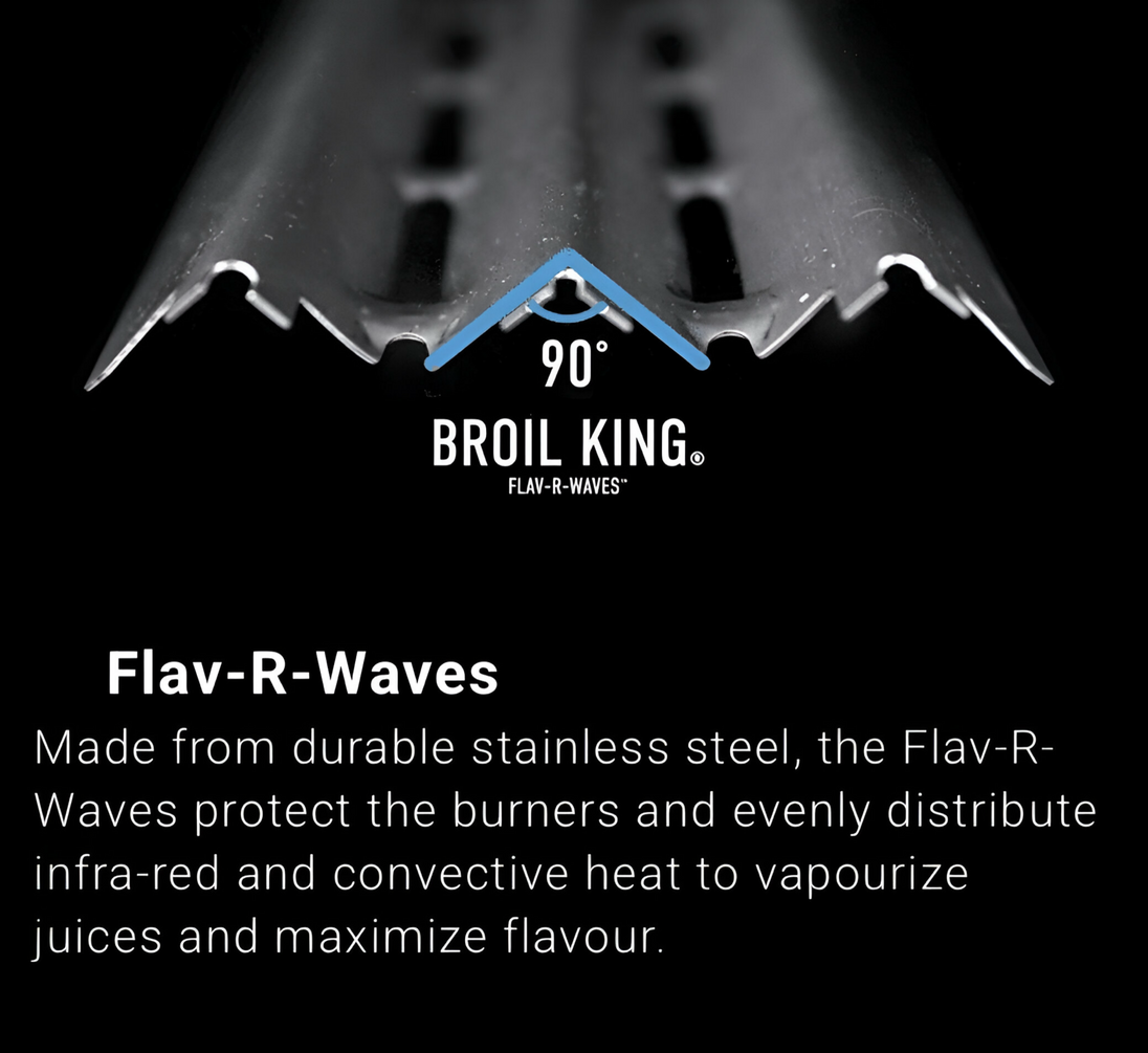 The patented Dual-Tube burners provide two rows of flame for unparalleled performance and exceptional heat distribution. The stainless steel Flav-R-Wave cooking system protects the burners while vaporizing drippings to enhance flavor. All Crown 400 series include heavy-duty 3-position cast iron cooking grids, black drop-down side shelves, and an enclosed black cabinet base.