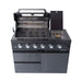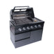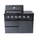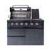 Elevate your outdoor entertaining with the Castelle Flame Premium Black Stainless Steel 4-Burner Gas Grill. This isn't just a grill; it's a complete outdoor cooking station equipped with an electric rotisserie kit and side burner.